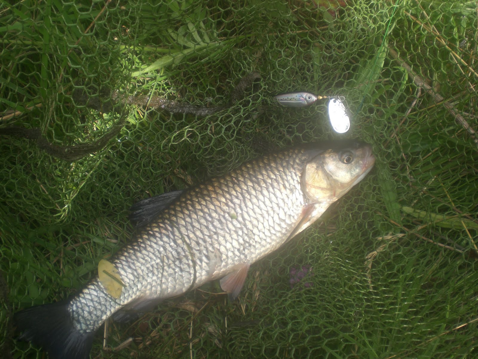 As the swim was so narrow, we took it in turns to run our floats through, again a few more dace, and then Tony managed to catch a lovely chub of about 4lbs. It wasn’t long before I had a fish of similar proportions. I had been concerned that we wouldn’t be able to land any decent sized fish in such a parrot cage of a swim, but the chub as so often is the case gave themselves up after a couple of strong runs.